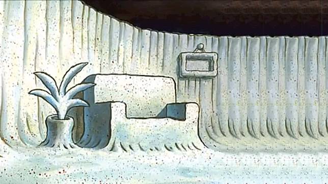 Rumah Patrick Star emang unik banget ya, semua perabotannya terbuat dari pasir, bahkan tanaman hiasnya pun juga terbuat dari pasir.